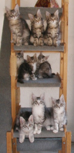 Chester joined the household in September 2004. His "proper" name is Holdermaines MeowerOfSimpleton, and he's a silver mackerel tabby with white Maine Coon cat. He's about 3 months old in the first photo. The second photo is of him and his 8 littermates; Chester is on the bottom, in the middle. Chester is a show-quality Maine Coon, and he'll be competing in the kitten and alter classes of many TICA shows on the West Coast through (at least) the 2004-2005 and 2005-2006 seasons.